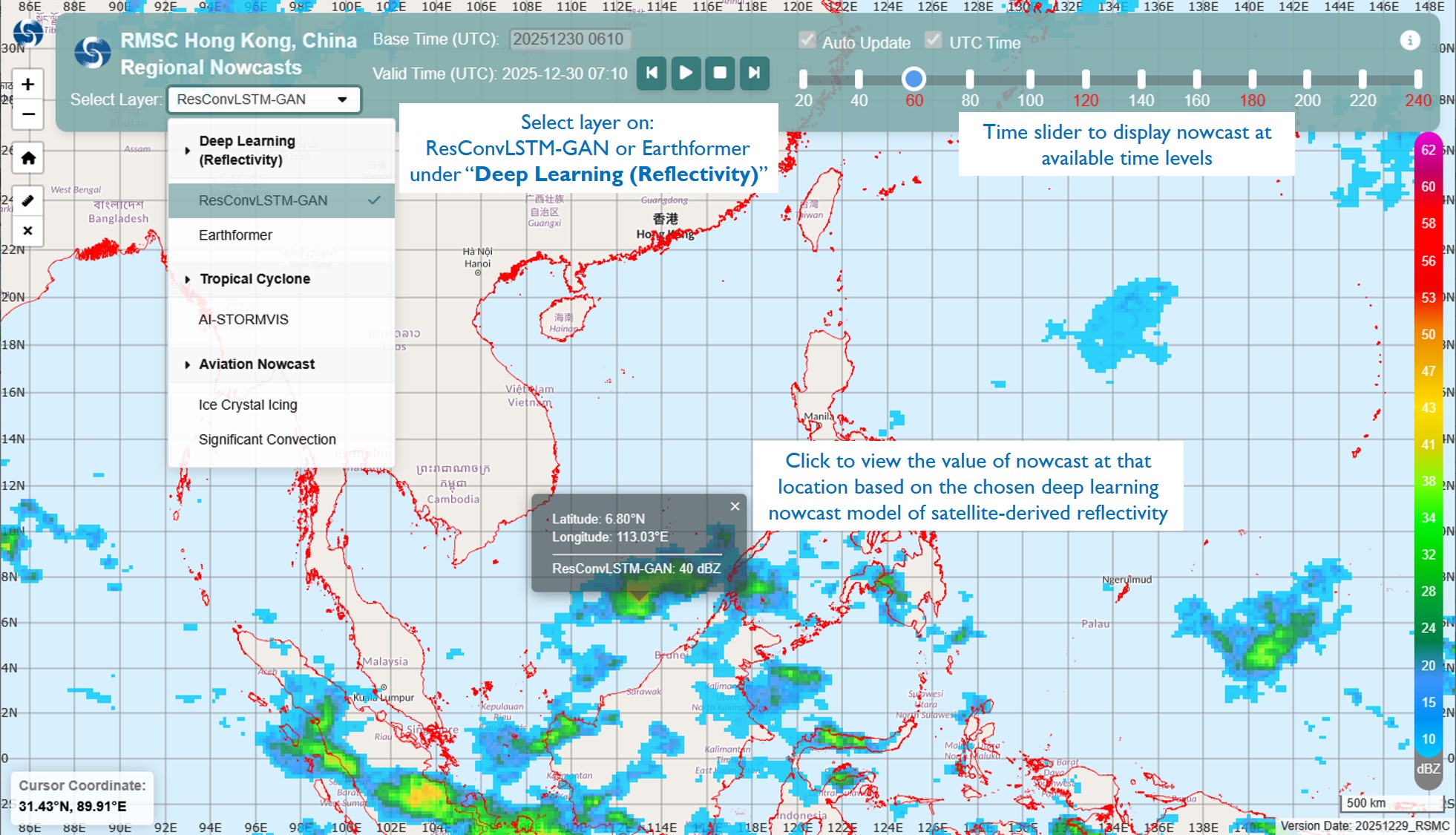 (a) The satellite-based reflectivity image is derived based on various imagery channels of JMA Himawari-8/9 satellite using artificial neural network. The satellite-derived reflectivity images are then input to two deep learning nowcast models, namely, ResConvLSTM-GAN and Earthformer to predict reflectivity for the next 4 hours (240 minutes) and 8 hours (480 minutes) respectively. More background and references on introducing deep learning techniques in HKO nowcasting system can refer to this web page.